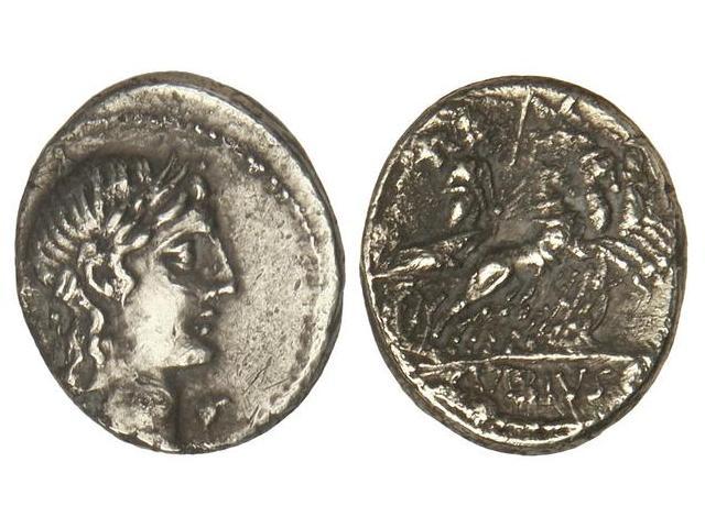 Denario. 90 a.C. VIBIA-1. C. Vibius C. f. Pansa. Anv.: Cabeza laureada de Apolo a derecha, debajo la barbilla, símbolo, detrás (PANSA). 3,50 grs. (Oxidaciones, golpecitos y rayitas). Cal-1345; FFC-1187. MBC-.