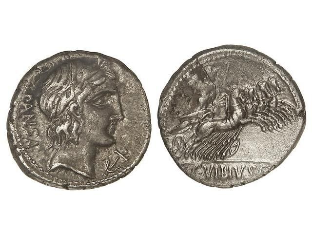 Denario. 90 a.C. VIBIA-2. C. Vibius C.f. Pansa. Anv.: Cabeza laureada de Apolo a derecha, detrás PANSA, delante símbolo. 3,92 grs. (Ligera grieta). Cal-1350; FFC-1194. MBC+.