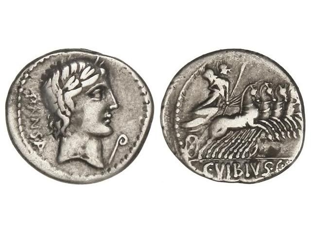Denario. 90 a.C. VIBIA-2. C. Vibius C.f. Pansa. Anv.: Cabeza laureada de Apolo a derecha, detrás PANSA, delante símbolo. 3,71 grs. Cal-1350; FFC-1194. (MBC+).
