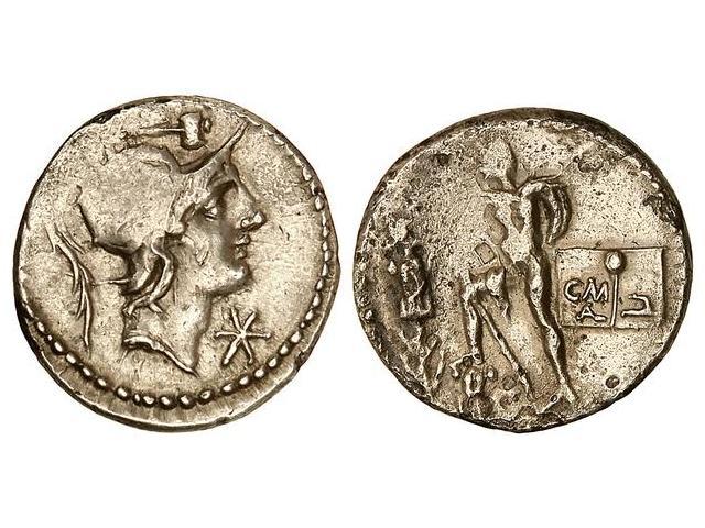 Denario. 91 a.C. POBLICIA-8. Caius Poblicius Malleolus. Rev.: Guerrero con clámide y lanza a izquierda apoyando el pie sobre una coraza, al lado, trofeo. (Oxidaciones limpiadas en reverso). Cal-1141; FFC-1014. (MBC+).
