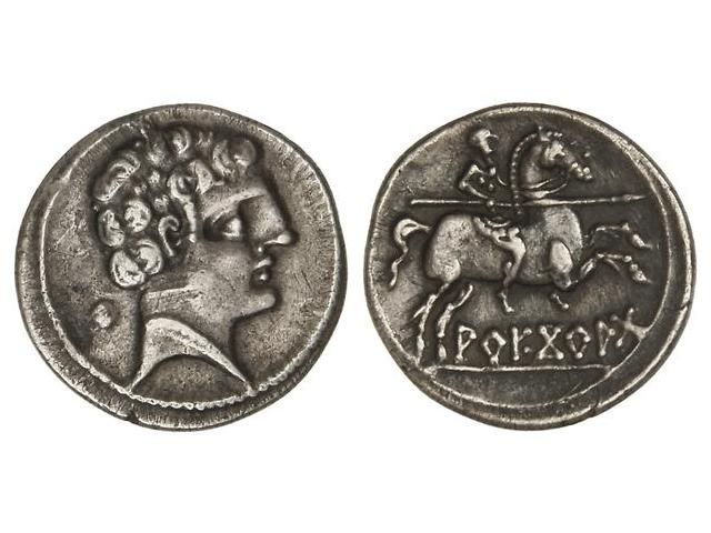 Denario. ARECORATAS. Anv.: Cabeza masculina a derecha, detrás punto. Rev.: Jinete con lanza a derecha, asomando los dos pies, debajo sobre raya, leyenda ibérica. 3,82 grs. AB-108 sim. MBC+.