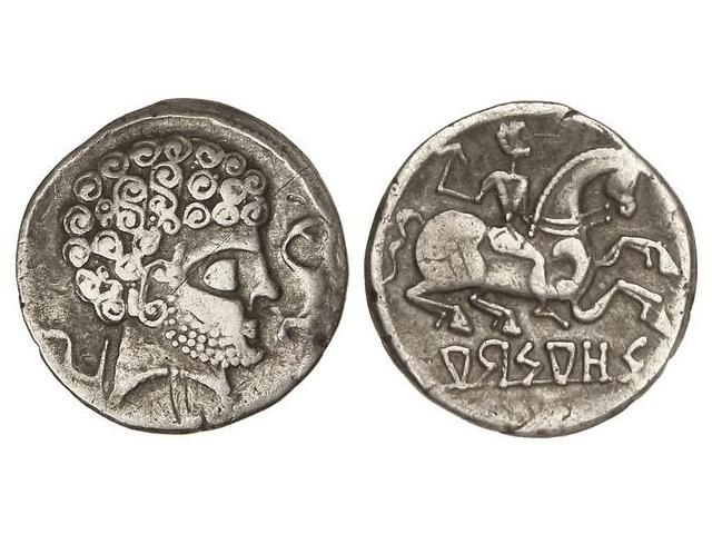 Denario. ARSAOS. Anv.: Cabeza barbada a derecha, delante delfín, detrás arado. Rev.: Jinete con dardo a derecha, debajo leyenda ibérica. 3,23 grs. AB-139. (MBC+).