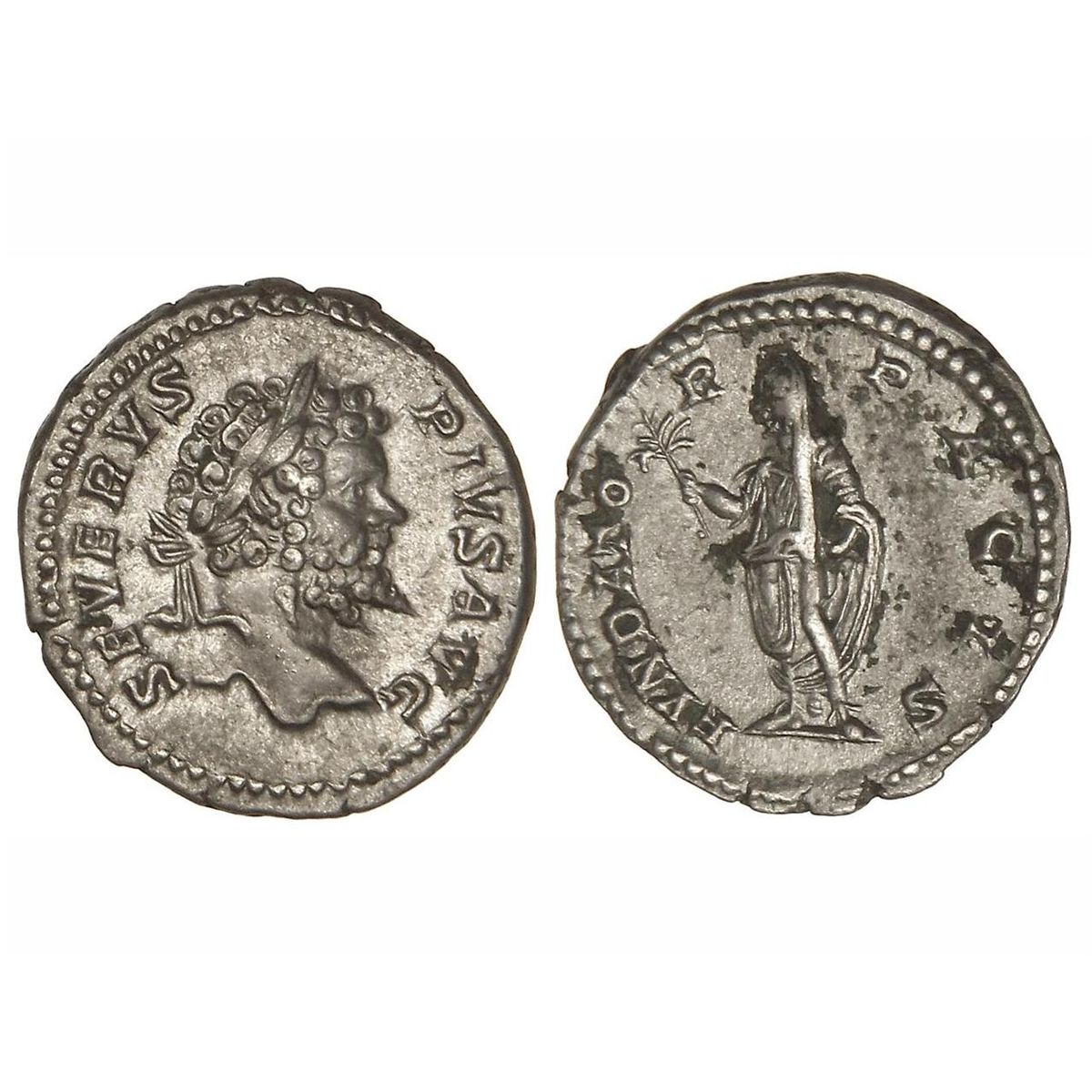 Denario. - Acuñada 202-210 d.C. - SEPTIMO SEVERO. - Anv.: SEVERVS PIVS AVG. Cabeza laureada a derecha. Rev.: FVNDATOR PACIS. Septimo Severo de pie con velo y rama de olivo a izquierda. 3,54 grs. AR. C-205. MBC+/EBC-. - -