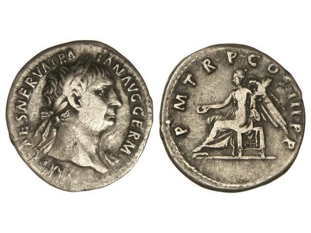 Denario. Acuñada el 100-101 d.C. TRAJANO. Anv.: Busto laureado a dereha. IMP. CAES. NERVA TRAIAN. AVG. GERM. Rev.: Victoria sedente a izquierda. P. M. TR. POT. COS. III P. P. 2,90 grs. AR. C-213.2. MBC/MBC-.