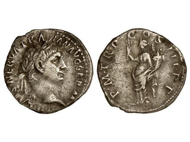 Denario. Acuñada el 114-117 d.C. TRAJANO. Anv.: IMP. CAES. NER. TRAIANO OPTIMO AVG. GER. DAC. Busto laureado a derecha. Rev.: Felicidad estante a izquierda portando caduceo y cornucopia. 3,30 grs. (Rayita en anverso). C-278. MBC+.