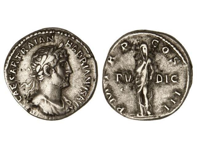 Denario. Acuñada el 117-138 d.C. ADRIANO. Anv.: (IMP.) CAESAR TRAIAN. HADRIANVS AVG. Busto laureado a derecha. Rev.: P. M. TR. P. COS. III. Pudibundez en pie de frente, en el campo PV-DIC. C-1209c. MBC+/MBC.