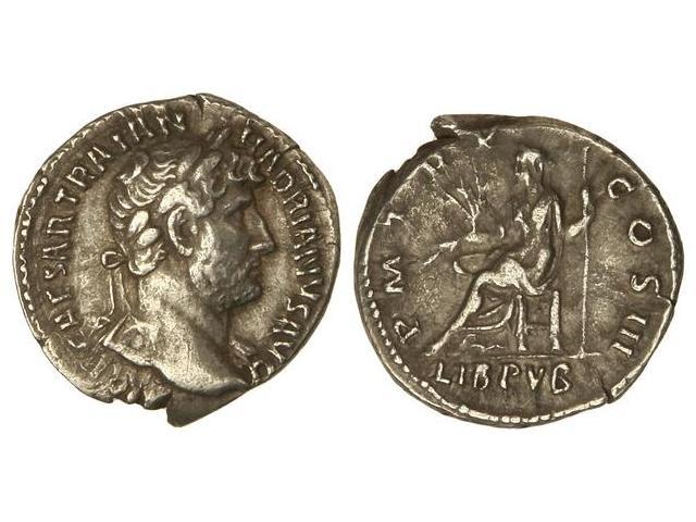 Denario. - Acuñada el 119-122 d.C. - ADRIANO. - Anv.: IMP. CAESAR TRAIAN. HADRIANVS AVG. Busto larueado a derecha. Rev.: LIB. PVB. P. M. TR. P. COS. III. Libertad sedente a izquierda, sobre un trono portando cetro y rama. 3,50 grs. C-903. MBC+/MBC. - -
