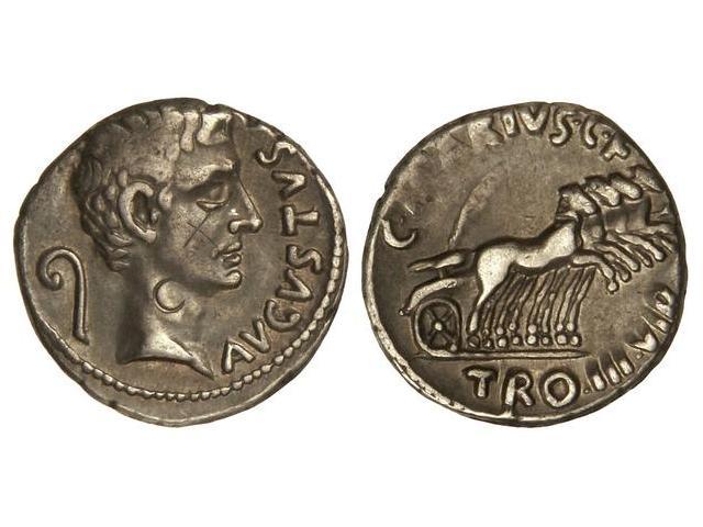 Denario. - Acuñada el 13 a.C. - AUGUSTO. - C. Marius C. f. Tromentina. - Anv.: Cabeza de Augusto a derecha, detrás lituo, delante AVGVSTVS. Rev.: Cuadriga a derecha, del carro sale una palma. C. MARIVS C. F. TRO. III VIR. 3,90 grs. (Marca de cambista y graffiti en anverso). C-456; Cal-969; FFC-282. MBC. - -
