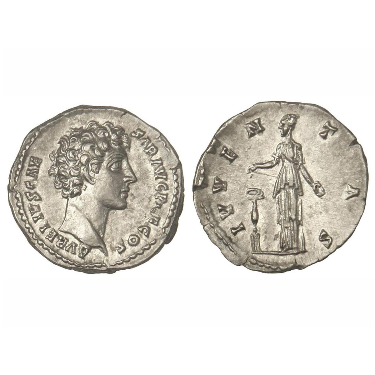 Denario. - Acuñada el 140-144 d.C. - MARCO AURELIO. - Anv.: AVRELIVS CAESAR AVG. PII. F. COS. Busto descubierto a derecha. Rev.: IVVENTAS. Juventud en pie a izquierda. 3,15 grs. C-389. EBC+/EBC. - -