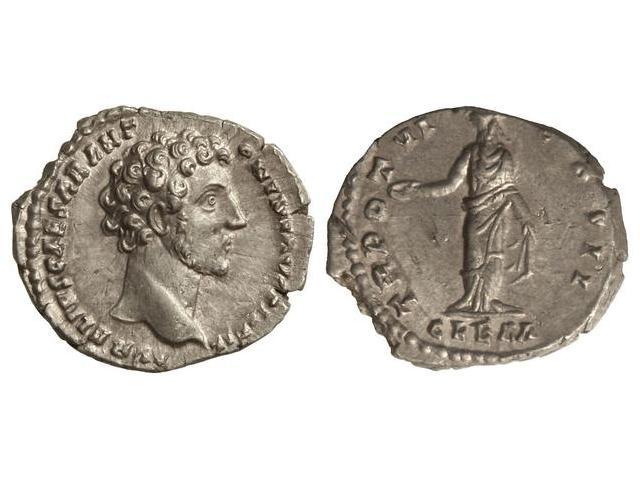 Denario. Acuñada el 149-152 d.C. MARCO AURELIO. Anv.: AVRELIVS CAESAR ANTONINI AVG. PII FIL. Busto a derecha. Rev.: TR. POT. III COS. II. En exergo: CLEM. Clemencia de pie a izquierda con pátera. 3,345 grs. Pátina. C-19. EBC.</B