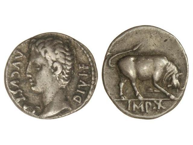 Denario. Acuñada el 15-13 a.C. AUGUSTO. Anv.: AVGVSTVS DIVI F. Cabeza descubierta a izquierda. Rev.: IMP. X. Toro a derecha. C-139. MBC+.