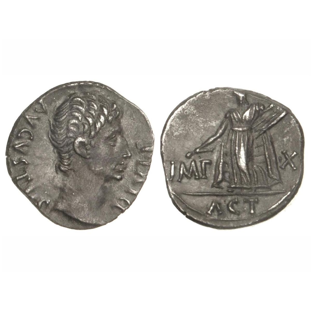 Denario. - Acuñada el 15-13 a.C. - AUGUSTO. - Anv.: AVGVSTVS DIVI F. Cabeza descubierta de Augusto a derecha. Rev.: IMP. X. Apolo en pie a izquierda. En exergo: ACT. 3,58 grs. Pátina oscura. C-144; Cal-828; FFC-111. EBC-/MBC+. - -