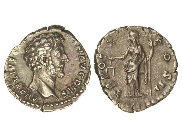 Denario. Acuñada el 155-156 d.C. MARCO AURELIO. Anv.: AVRELIVS (CAES. ANTO)N. AVG. PII F. Cabeza descubierta a derecha. Rev.: TR. POT. (C) COS. II. Equidad en pie a izquierda. Ligera pátina. C-702. EBC/EBC-.