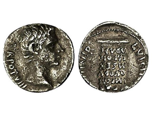 Denario. Acuñada el 16 a.C. AUGUSTO. L. Vinicius L.f. Anv.: (AVGVSTVS) TR. POT. VII. Cabeza descubierta de Augusto a derecha. Rev.: L. VINI(CIVS L. F.) III VIR. Pilastra con inscripción: S.P.Q.R./IMP.CAE./QVOD.V./MS.EX/EA.P.QIS./AD.A.DE. (Algunas oxidaciones). RARA. C-542; Cal-1385; FFC-332. MBC+.
