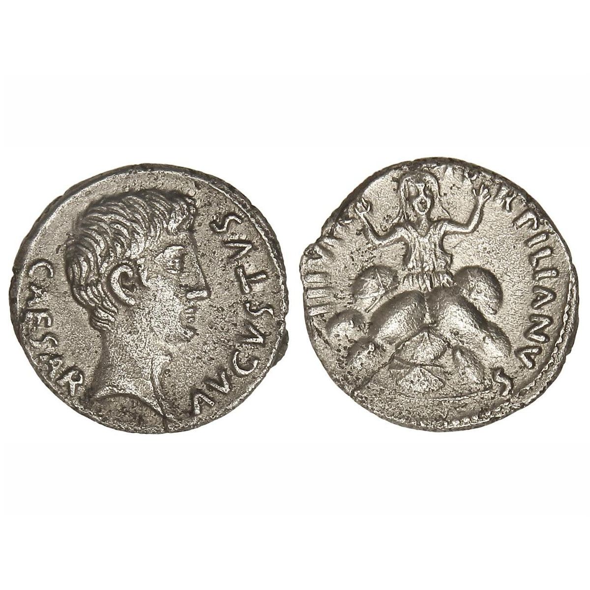 Denario. - Acuñada el 18 a.C. - AUGUSTO. - P. Petronius Turpilianus. - Anv.: CAESAR AVGVSTVS. Cabeza descubierta de Augusto a derecha. Rev.: TVRPILIANVS III. VIR. Tarpeia de frente levantando los brazos sobre escudo. 3,63 grs. (Cristalizada y oxidaciones limpiadas). C-494; Cal-1089; FFC-317. (EBC-). - -