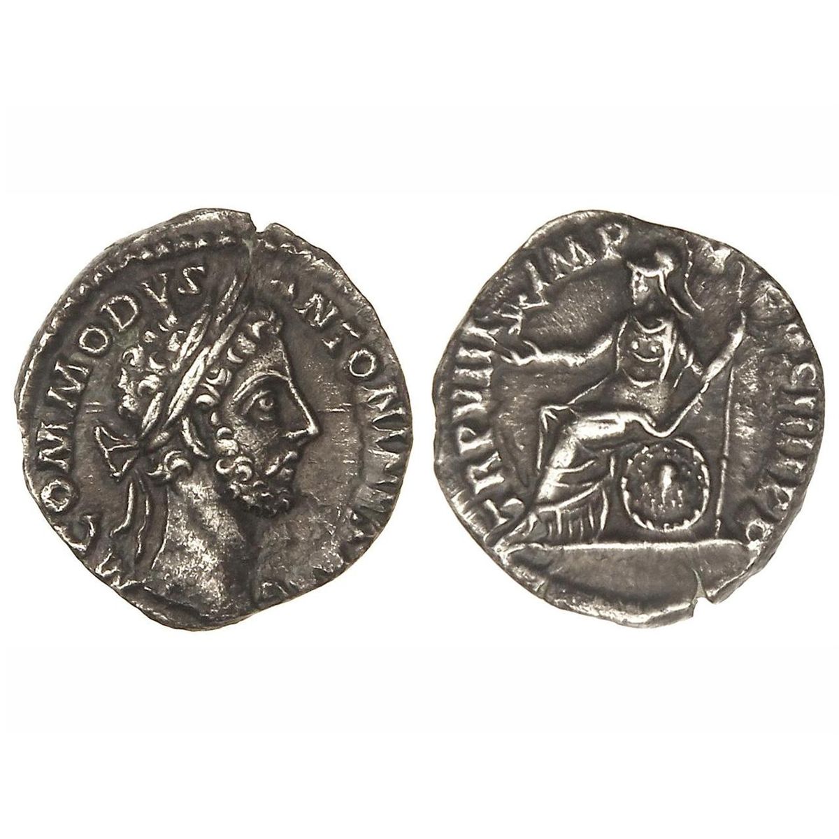 Denario. - Acuñada el 180-183 d.C. - CÓMODO. - Anv.: M. COMMODVS ANTON. AVG. PIVS. Busto a derecha. Rev.: TR. P. VIII IMP. VI COS. IIII P. P. Victoria sentada con escudo. Pátina. C-888. EBC-. - -