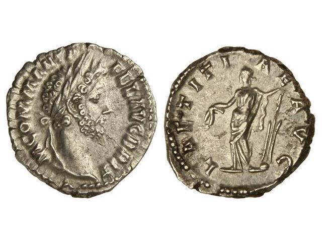Denario. - Acuñada el 184-189 d.C. - CÓMODO. - Anv.: M. COMM. ANT. P. FEL. AVG. BRIT. Cabeza laureada a derecha. Rev.: LAETITIAE AVG. Alegría en pie de frente, cabeza a izquierda con espigas y timón sobre globo. 3,60 grs. C-279. EBC-. - -