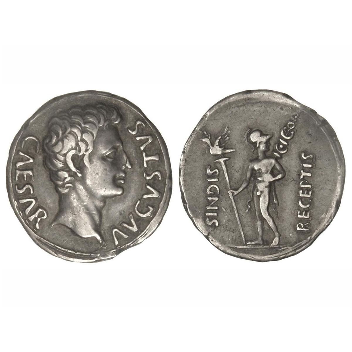 Denario. - Acuñada el 19 a.C. - AUGUSTO. - COLONIA PATRICIA. Córdoba. - Anv.: CAESAR AVGVSTVS. Cabeza descubierta de Augusto a derecha. Rev.: SIGNIS RECEPTIS. Marte en pie a izquierda con águila romana e insignia militar. 3,74 grs. (Limaduras en canto). AB-1268; C-259; Cal-742; FFC-175. MBC+. - -