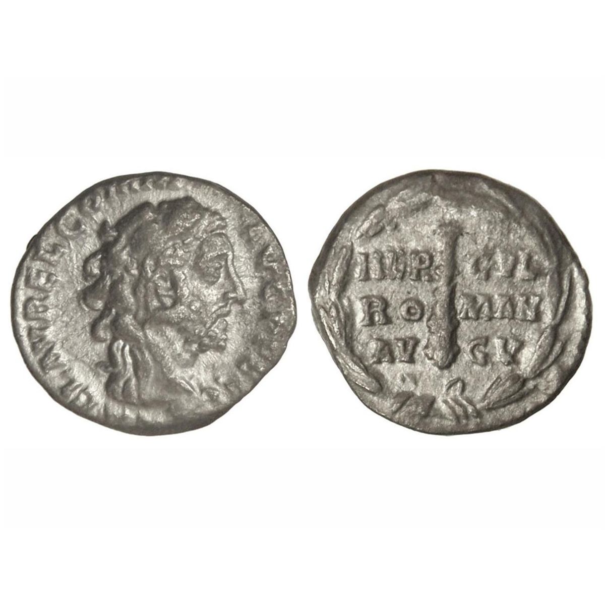 Denario. - Acuñada el 191-192 d.C. - CÓMODO. - Anv.: L. AEL. AVREL. COMM. AVG. P. FEL. Busto con piel de león a derecha. Rev.: HERCVL/ROMAN/AVG y maza, todo rodeado de corona. 2,24 grs. C-190. EBC-. - -