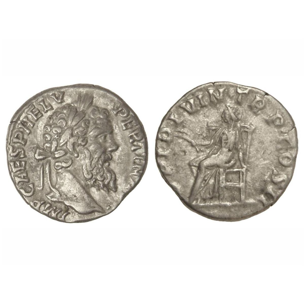 Denario. - Acuñada el 193 d.C. - PERTINAX. - Anv.: IMP. CAES. H. HELV. PERTIN. AVG. Busto laureado a derecha. Rev.: OPI DIVIN. TR. P. COS. II. Obra Divina sentada a izquierda. 3,35 grs. RARA. C-33. MBC+/MBC. - -