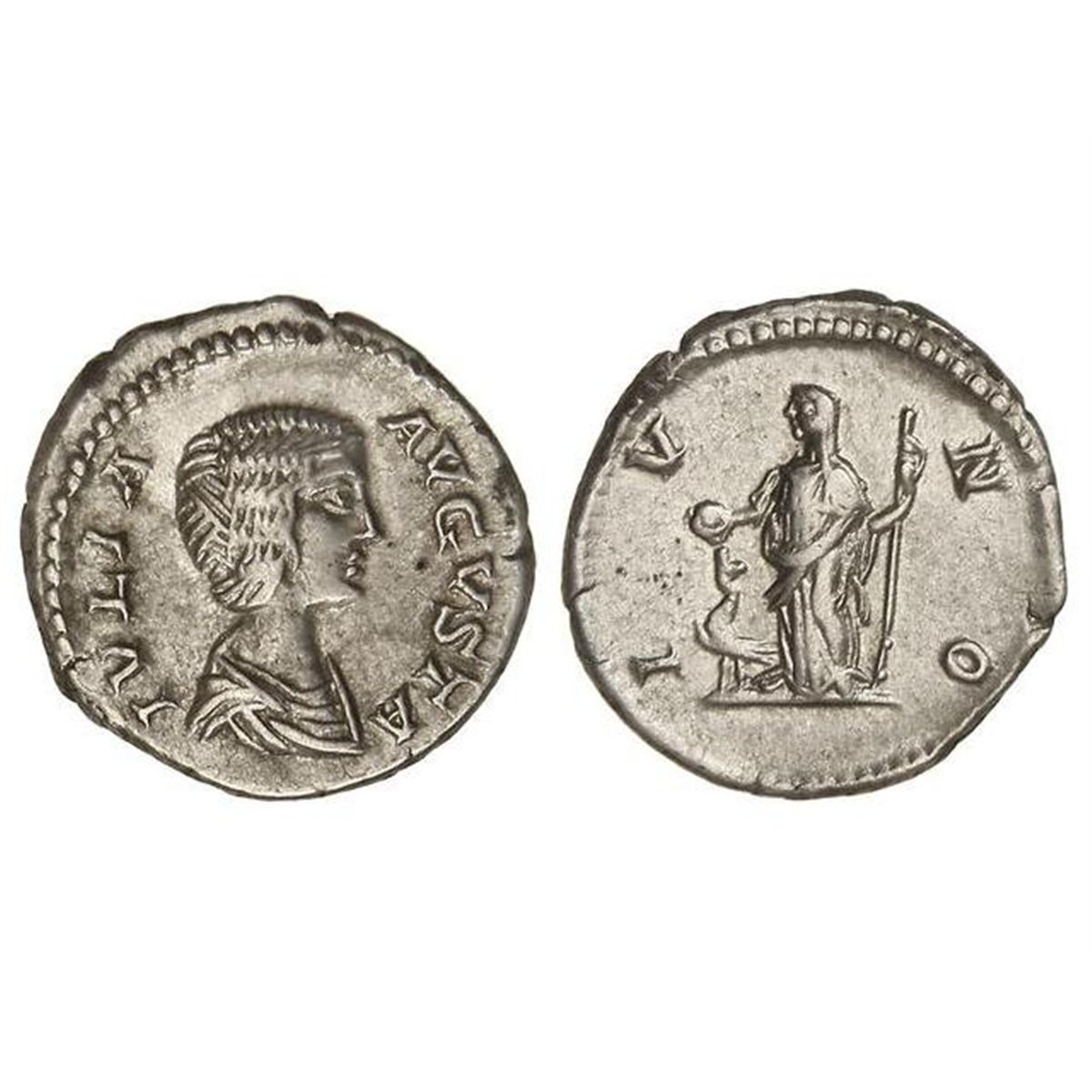 Denario. - Acuñada el 196-211 d.C. - JULIA DOMNA. - Anv.: IVLIA AVGVSTA. Busto a derecha. Rev.: IVNO. Juno a izquierda portando pátera y cetro. 3,43 grs. C-82. EBC-/MBC+. - -