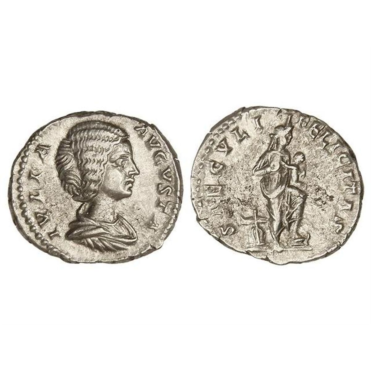 Denario. - Acuñada el 196-211 d.C. - JULIA DOMNA. - Anv.: IVLIA AVGVSTA. Busto a derecha. Rev.: SAECVLI FELICITAS. Isis acunando al niño Horus. C-174. EBC-/MBC+. - -