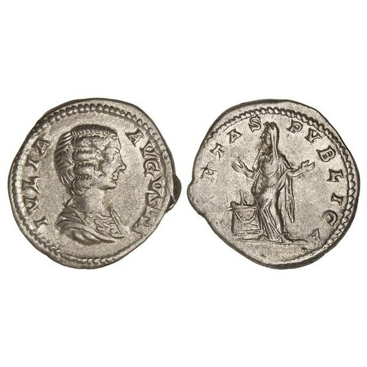 Denario. - Acuñada el 196-211 d.c. - JULIA DOMNA. - Anv.: IVLIA AVGSTA. Busto a derecha. Rev.: PIETAS PVBLICA. Piedad a izquierda junto a un altar con las manos alzadas. 3,22 grs. C-156. MBC+. - -