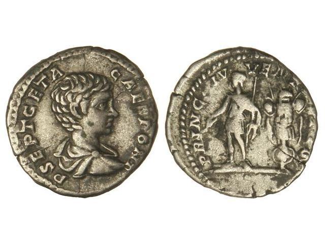 Denario. Acuñada el 199-202 d.C. GETA. Anv.: P. SEPT. GETA. CAES. PONT. Busto a derecha. Rev.: PRINC. IVVENT(__). Geta estante junto a trofeo. 3,30 grs. C-157. MBC+/MBC.
