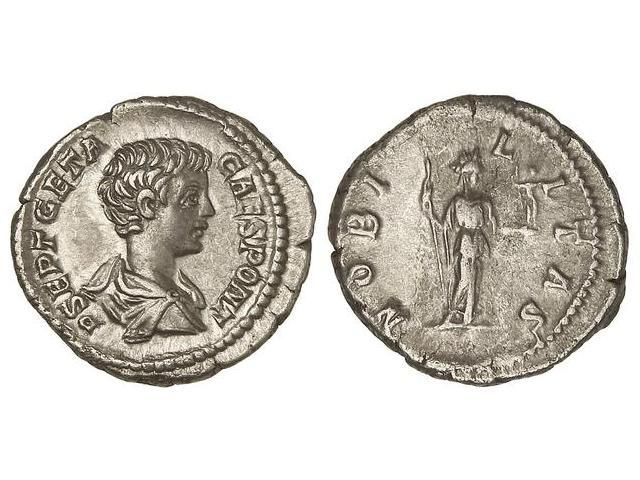 Denario. Acuñada el 200-202 d.C. GETA. Anv.: P. SEPT. GETA. CAES. PONT. Busto a derecha. Rev.: NOBILITAS. Nobleza en pie a derecha, portando cetro y paladión. 3,64 grs. C-90. EBC-.