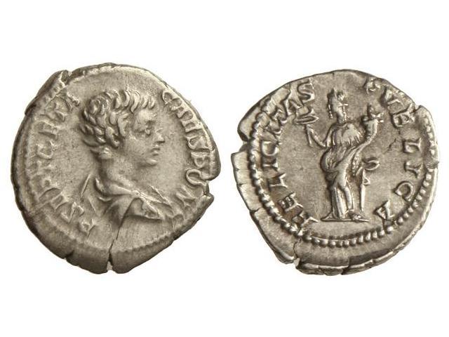 Denario. Acuñada el 200-202 d.C. GETA. Anv.: P. SEPT. GETA CAES. PONT. Busto a derecha. Rev.: FELICITAS PVBLICA. Felicidad estante a izquierda, portando caduceo y cornucopia. 3,313 grs. C-38. MBC+.