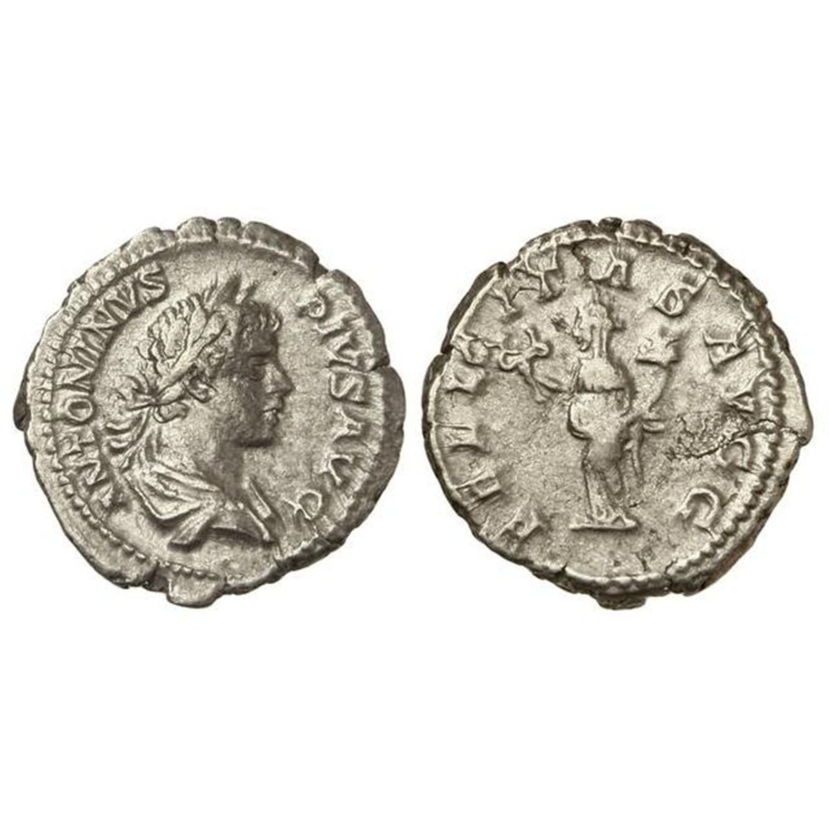 Denario. - Acuñada el 201-210 d.C. - CARACALLA. - Anv.: ANTONINVS PIVS AVG. Busto laureado a derecha. Rev.: FELICITAS AVGG. Felicidad estante con caduceo y cornucopia. 3,50 grs. S-64. MBC/MBC-. - -