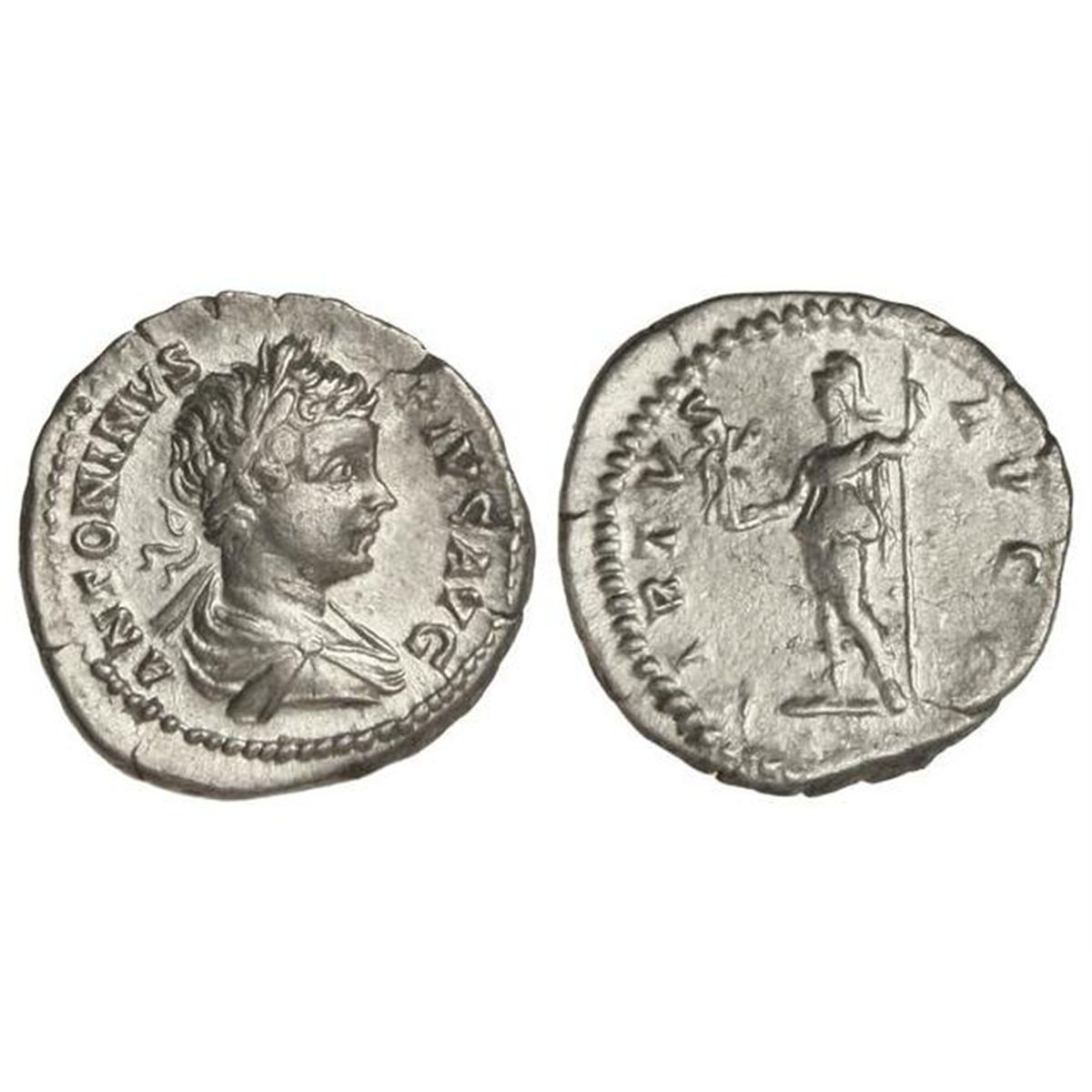Denario. - Acuñada el 201-210 d.C. - CARACALLA. - Anv.: ANTONINVS PIVS AVG. Busto laureado a derecha. Rev.: VIRTVS AVGG. Virtud en pie a izquierda. 3,24 grs. C-665a. MBC+/MBC. - -