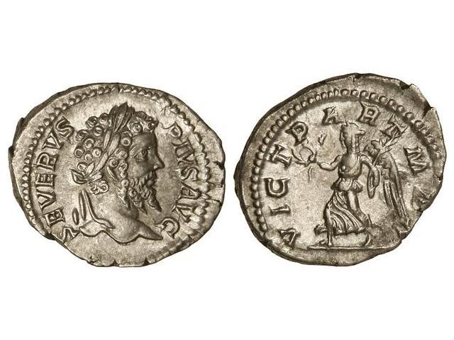 Denario. Acuñada el 201-210 d.C. SEPTIMIO SEVERO. Anv.: SEVERVS PIVS AVG. Busto laureado a derecha. Rev.: VICT. PART. MAX. Victoria en marcha a izquierda. C-744. EBC-/MBC+.