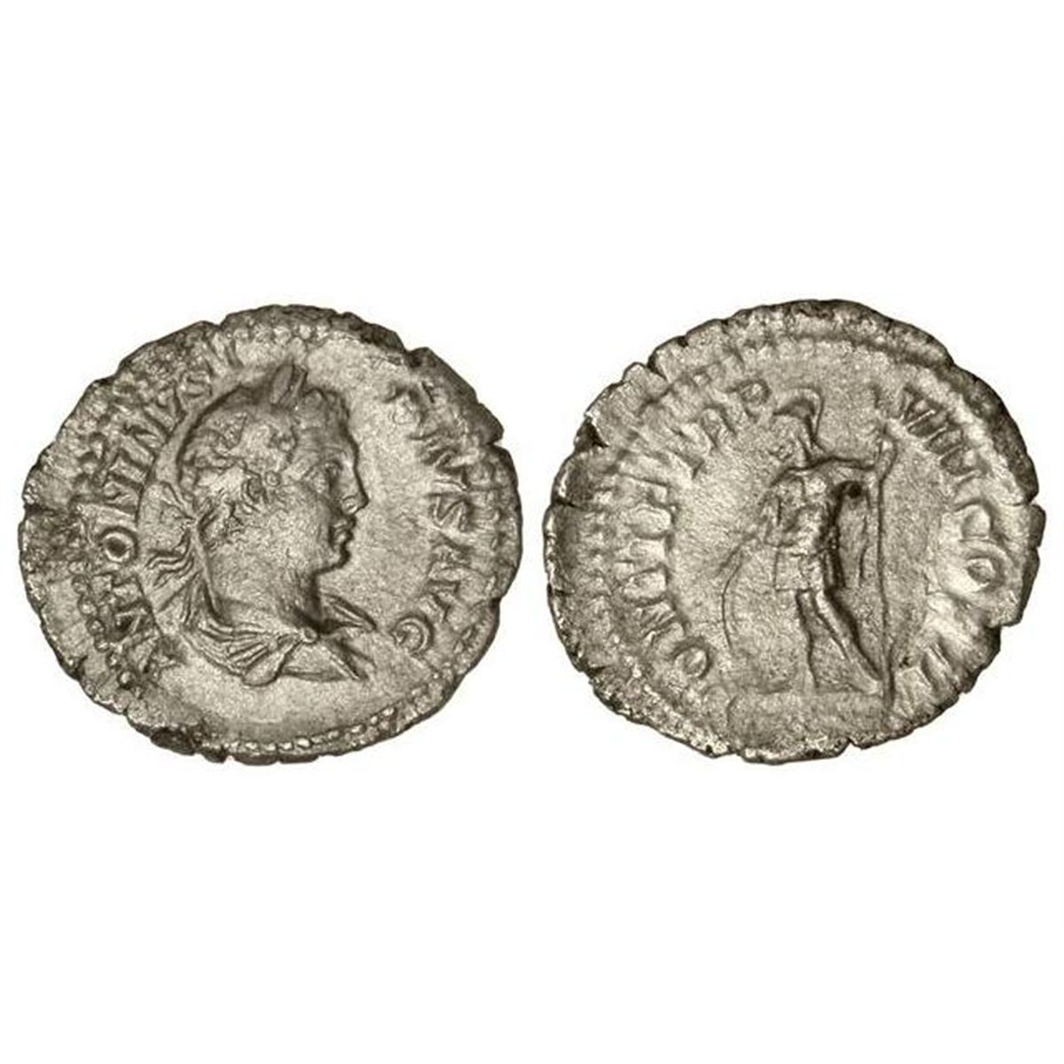 Denario. - Acuñada el 205 d.C. - CARACALLA. - Anv.: ANTONINVS PIVS AVG. Busto laureado a derecha. Rev.: PONTIF. TR. P. VIII COS. II. Marte en pie a izquierda con lanza y reposando en un escudo. 3,10 grs. (Oxidaciones limpiadas). C-421. MBC. - -