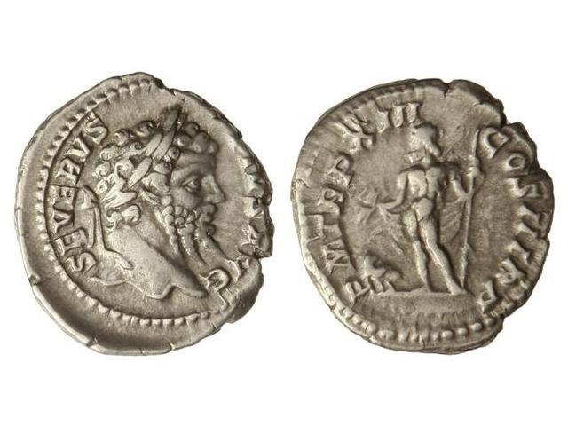 Denario. Acuñada el 205 d.C. SEPTIMIO SEVERO. Anv.: SEVERVS PIVS AVG. Cabeza laureada a derecha. Rev.: P. M. TR. P. XIII COS. III P. P. Júpiter estante a izquierda a sus pies águila. 3,30 grs. C-469. MBC+.