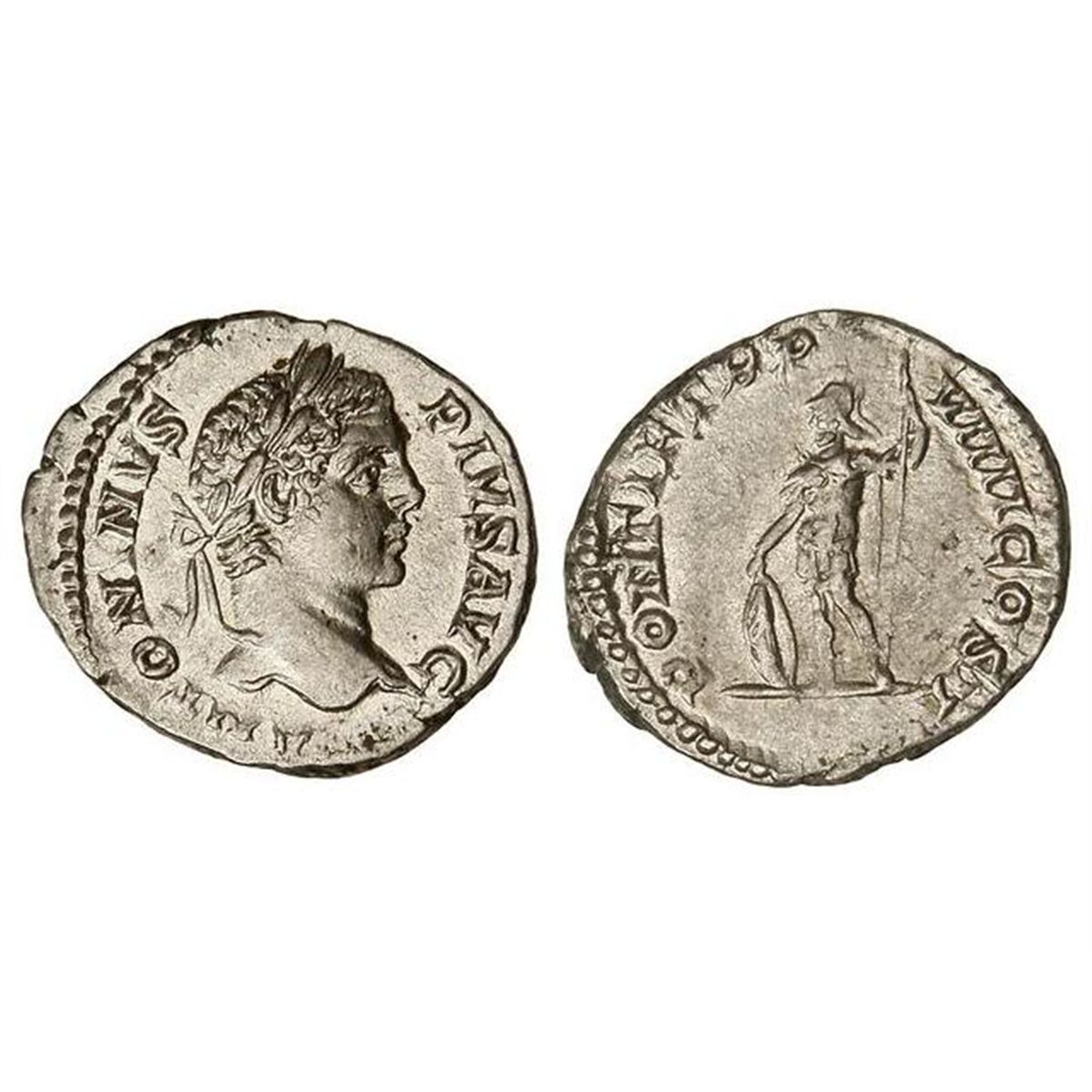 Denario. - Acuñada el 206 d.C. - CARACALLA. - Anv.: ANTONINVS PIVS AVG. Cabeza laureada a derecha. Rev.: PONTIF. TR. P. VIIII COS. II. Marte en pie a izquierda con lanza y escudo. C-424. EBC-/MBC+. - -