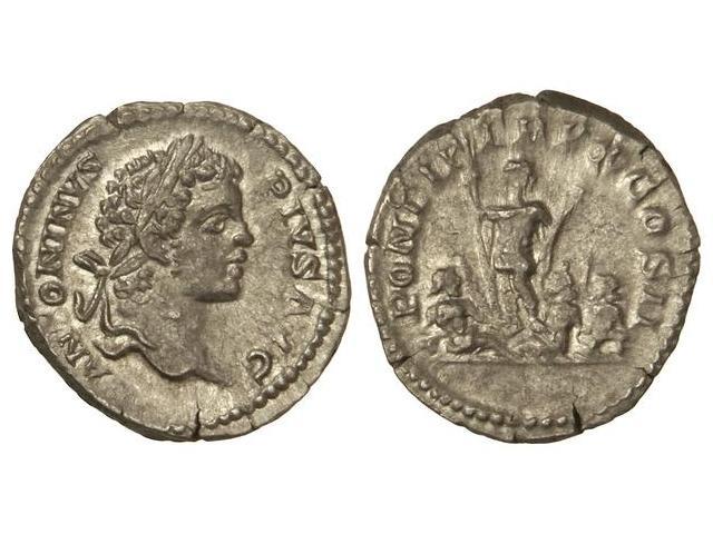 Denario. - Acuñada el 207 d.C. - CARACALLA. - Anv.: ANTONINVS PIVS AVG. Cabeza joven laureada a derecha. Rev.: PONTIF. TR. P. X COS. II. Caracalla en pie con lanza y parazonio, a izquierda dios del Río, a derecha dos cautivos. 3,50 grs. ESCASA. C-441. EBC-/MBC. - -
