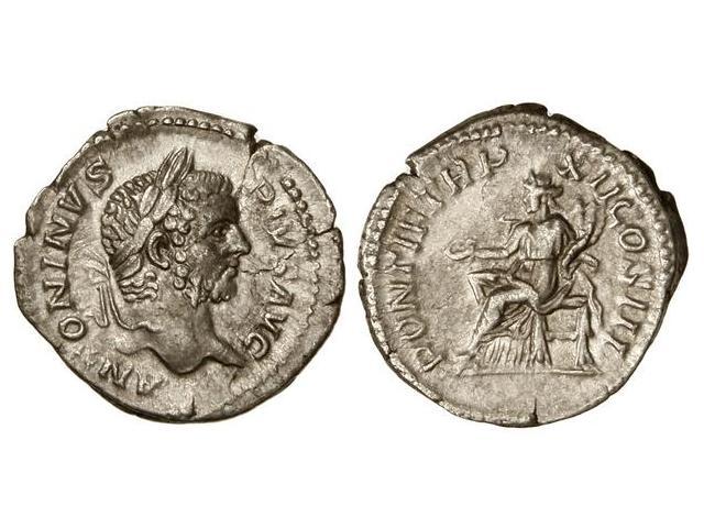 Denario. Acuñada el 209 d.C. CARACALLA. Anv.: ANTONINVS PIVS AVG. Busto laureado a derecha. Rev.: PONTIF. TR. P. XII COS. III. Concordia sentada a izquierda. C-465. MBC+.