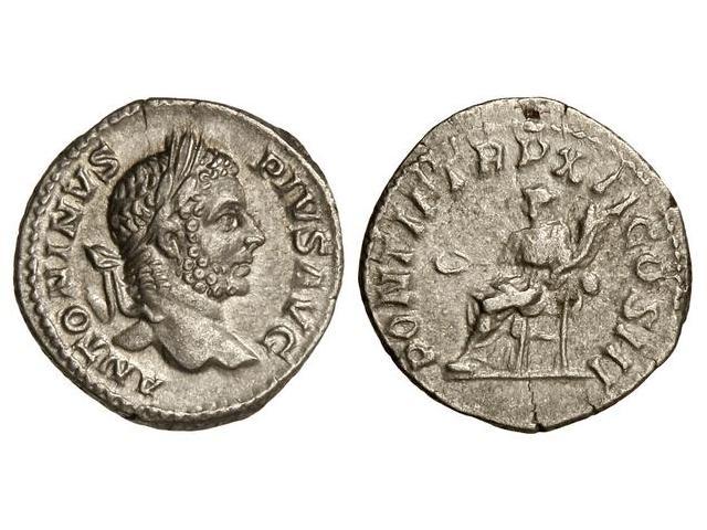 Denario. Acuñada el 209 d.C. CARACALLA. Anv.: ANTONINVS PIVS AVG. Cabeza laureada a derecha. Rev.: PONTIF. TR. P. XII COS. III. Concordia sentada a izquierda. C-465. MBC+/MBC.