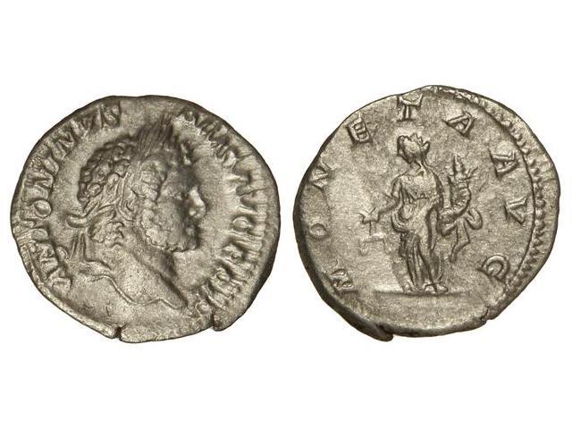 Denario. Acuñada el 210-213 d.C. CARACALLA. Anv.: ANTONINVS PIVS AVG. BRIT. Cabeza laureada a derecha. Rev.: MONETA AVG. Moneda en pie a izquierda. 2,90 grs. AR. C-165. MBC+.