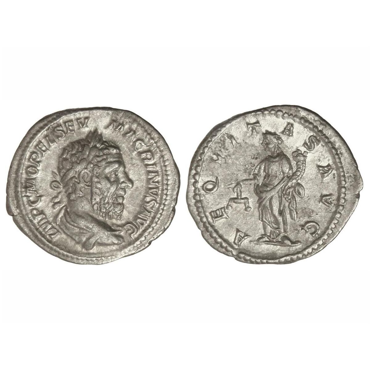 Denario. - Acuñada el 217-218 d.C. - MACRINO. - Anv.: IMP. C. M. OPEL SEV. MACRINVS AVG. Busto laureado a derecha. Rev.: AEQVITAS AVG. Equidad en pie a izquierda. 2,46 grs. C-2. EBC-. - -