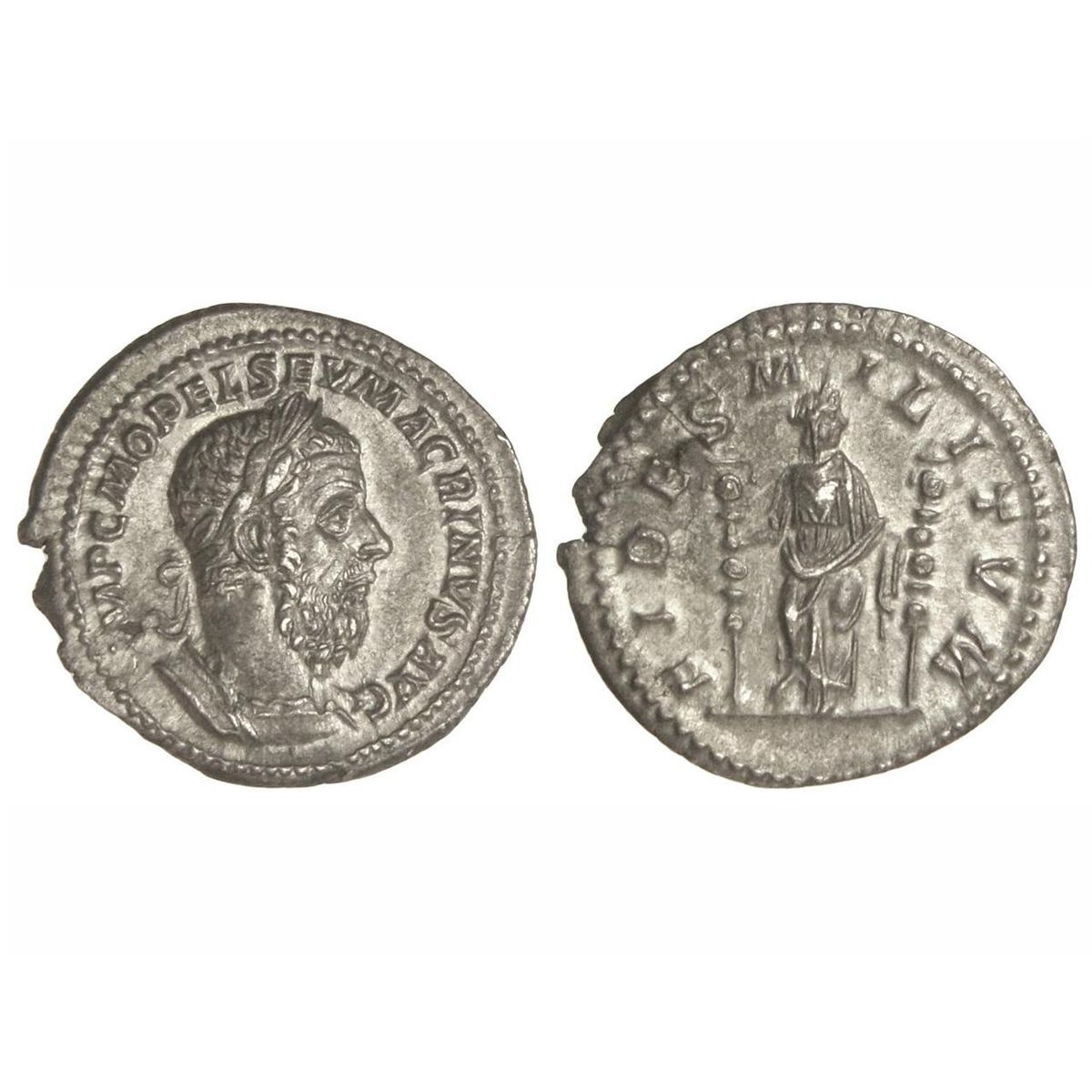 Denario. - Acuñada el 217-218 d.C. - MACRINO. - Anv.: IMP. C. M. OPEL SEV. MACRINVS AVG. Busto laureado a derecha. Rev.: FIDES MILITVM. Fe en pie de frente portando dos estandartes. 3,37 grs. C-23. EBC+/EBC. - -