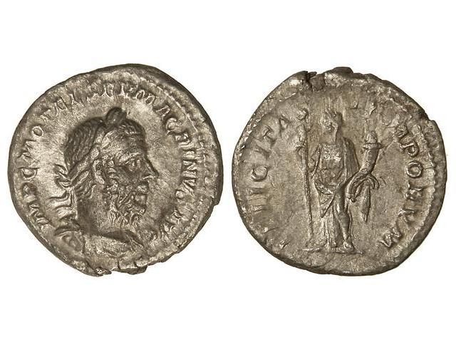 Denario. Acuñada el 217-218 d.C. MACRINO. Anv.: IMP. C. M. OPEL. SEV. MACRINVS AVG. Busto laureado a derecha. Rev.: FELICITAS TEMPORVM. Felicidad en pie a izquierda con cetro y cornucopia. C-15. (MBC+).