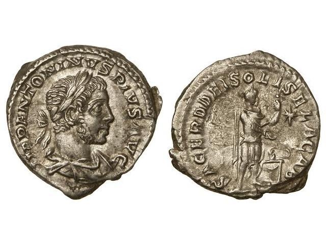 Denario. Acuñada el 220-222 d.C. HELIOGÁBALO. Anv.: IMP. ANTONINVS PIVS AVG. Busto laureado a derecha. Rev.: SACERD DEI SOLIS ELAGAB. Heliogábalo ceremoniando a derecha. C-246a. EBC-/MBC+.