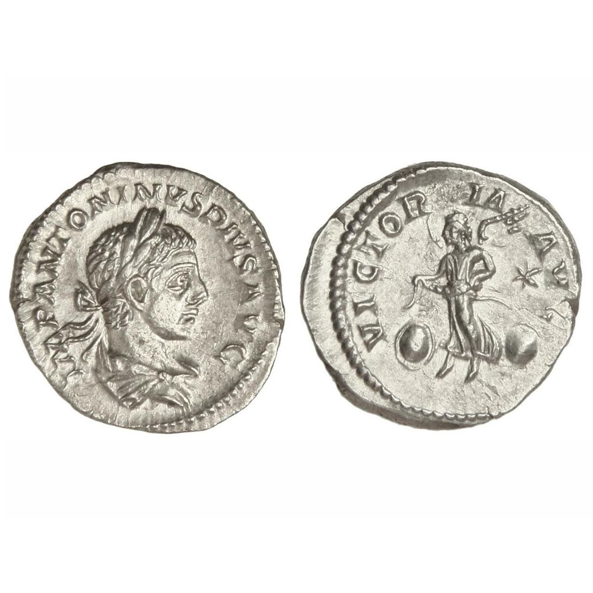 Denario. - Acuñada el 220-222 d.C. - HELIOGÁBALO. - Anv.: IMP. ANTONINVS PIVS AVG. Busto laureado a derecha. Rev.: VICTORIA AVG. Victoria volando a izquierda entre dos escudos, detrás estrella. 3,25 grs. C-300a. EBC+. - -