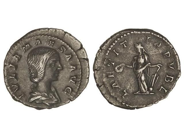 Denario. Acuñada el 223 d.C. JULIA MAESA. Anv.: IVLIA MAESA AVG. Busto a derecha. Rev.: LAETITIA PVBL. Alegría estante con guirnalda y timón sobre globo. 3,09 grs. Pátina. C-26. MBC+.