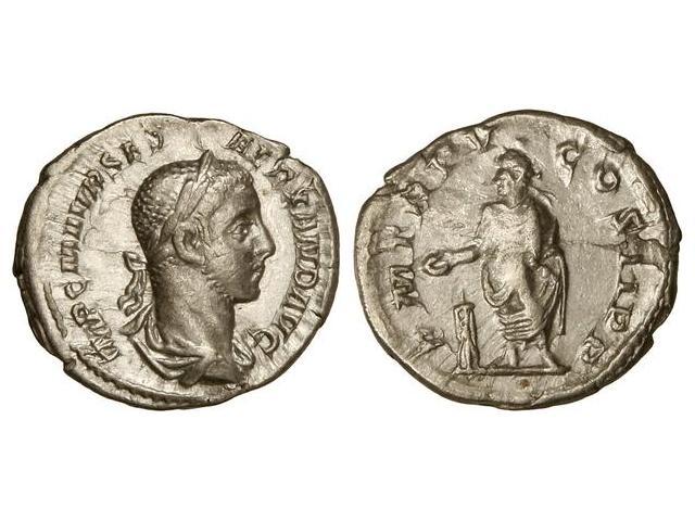 Denario. Acuñada el 226 d.C. ALEJANDRO SEVERO. Anv.: IMP. C. M. AVR. SEV. ALEXAND. AVG. Busto laureado a derecha. Rev.: P. M. TR. P. V COS. II P. P. El Emperador en pie a izquierda. C-289. MBC+.