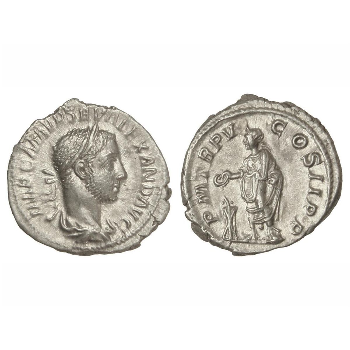 Denario. - Acuñada el 226 d.C. - ALEJANDRO SEVERO. - Anv.: IMP. C. M. AVR. SEV. ALEXAND. AVG. Busto laureado a derecha. Rev.: P. M. TR. P. V COS. II P. P. Alejandro Severo en pie a izquierda sacrificando sobre un altar. 2,85 grs. C-289. EBC. - -