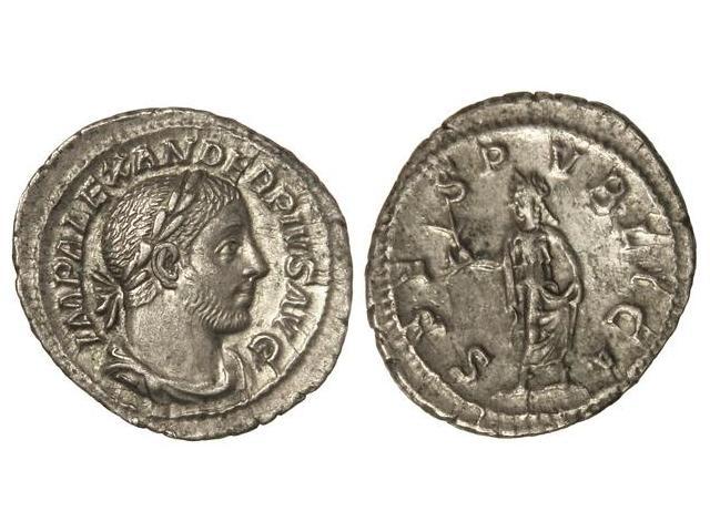 Denario. Acuñada el 231-235 d.C. ALEJANDRO SEVERO. Anv.: IMP. ALEXANDER PIVS AVG. Busto laureado a derecha. Rev.: SPES PVBLICA. Esperanza en marcha a izquierda, con una flor. 3,16 grs. C-543. EBC/MBC+.