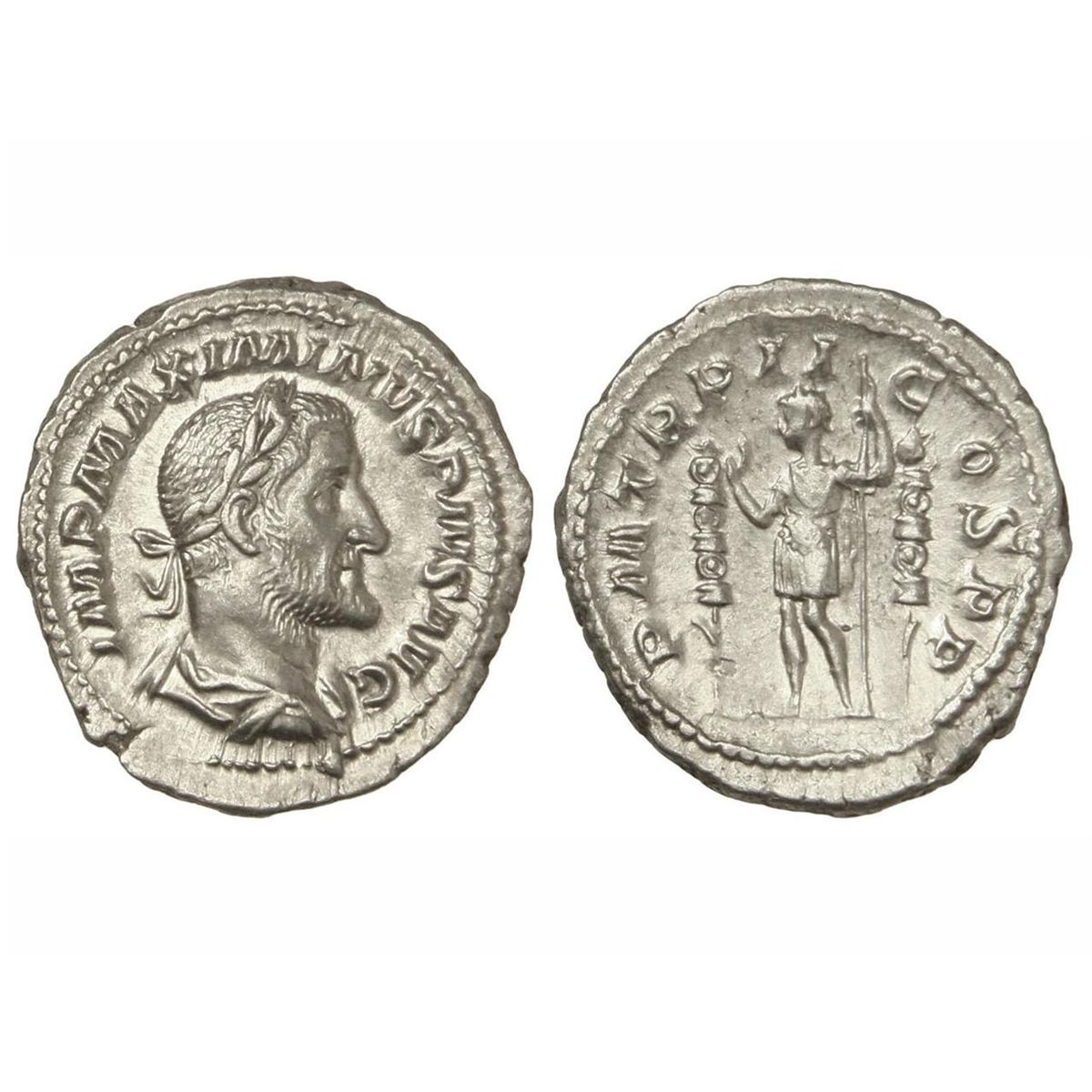 Denario. - Acuñada el 236 d.C. - MAXIMINO I. - Anv.: IMP. MAXIMINVS PIVS AVG. Busto laureado a derecha. Rev.: P. M. TR. P. II COS. P. P. Maximino en pie a izquierda entre dos estandartes. 3,47 grs. C-55. EBC+/EBC. - -